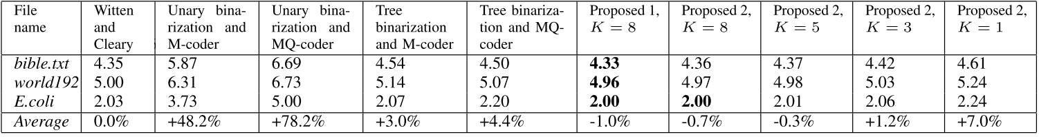 For more detailed information please see [1]. 2. Performance comparison For comparisons, we used classic Witten and Cleary multi-alphabet adaptive arithmetic coding implementation and four multi-alphabet adaptive arithmetic coding based on adaptive BAC. As an adaptive BAC we used MQ-coder from JPEG2000 image coding standard and M-coder from H.264/AVC and H.265/HEVC video coding standards. For representing non-binary data into binary format we applied unary binarization and tree binarization. The proposed coder was realized in two versions. The first version, denoted as Proposed 1, is the case, when the best window length was selected for each file, while Proposed 2 utilizes single window for all files using different precision of approximation of the multiplication (higher K means better precision). The following table shows the compression performance for Large Calgary Corpus. Here we use Witten and Cleary's implementation as reference coder and compare it with the multiplication-free implementations, so that an average gain with sign '-' means that a considered coder provides better results than the reference one. ![]() The following table shows the compression performance for Large Corpus. ![]() The presented results show that: